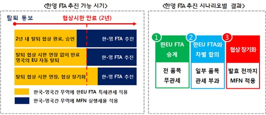 이어 "우리 정부는 국제무대에서 브렉시트에 따른 보호무역주의 및 고립주의가 확산되지 않도록 국가 간 공조를 강화하는 데 앞장서야 한다"고 강조했다.한․영 FTA 추진 시기 및 시나리오별 결과 <사진제공=한국무역협회>