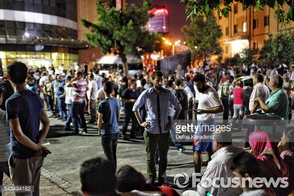 (이스탄불/터키=게티/포커스뉴스) 28일 터키 이스탄불 아타튀르크 국제공항에서 자살 폭탄 테러가 발생했다. 테러의 충격에서 벗어나지 못한 수많은 사람들이 공항 인근에서 망연자실한 채 있다.