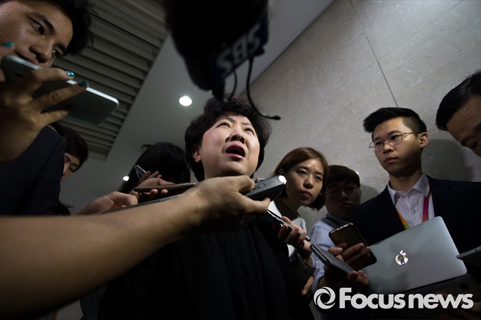 (서울=포커스뉴스) 박인숙 새누리당 의원이 29일 오전 서울 여의도 국회에서 5촌 조카를 5급 비서관에, 동서를 비서에 채용한 사실을 밝히며 국민들에게 사과 입장을 밝히는 기자회견을 마친 뒤 취재진 질문에 답하고 있다.