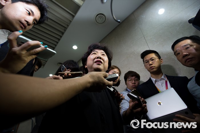 (서울=포커스뉴스) 박인숙 새누리당 의원이 29일 오전 서울 여의도 국회에서 5촌 조카를 5급 비서관에, 동서를 비서에 채용한 사실을 밝히며 국민들에게 사과 입장을 밝히는 기자회견을 마친 뒤 취재진 질문에 답하고 있다.