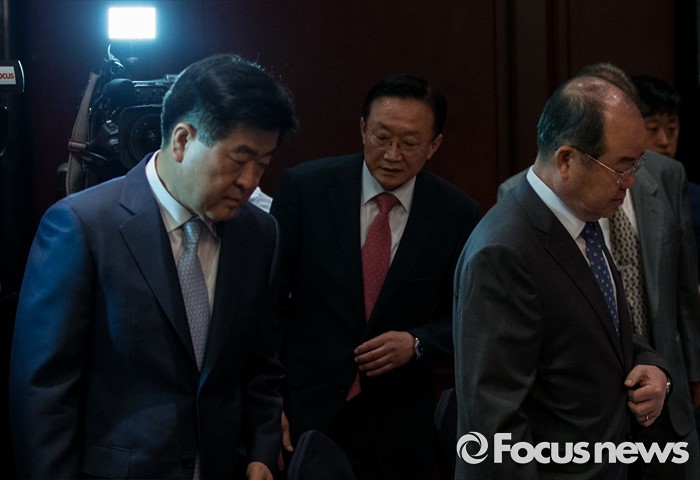 (서울=포커스뉴스) 29일 오전 서울 강남구 그랜드 인터콘티넨탈 호텔에서 열린 산업부 주최 조선업계 CEO ·전문가 간담회에 참석한 권오갑(왼쪽부터) 현대중공업 사장, 박대영 삼성중공업 사장, 정성립 대우조선해양 사장이 기념촬영 후 착석하고 있다.