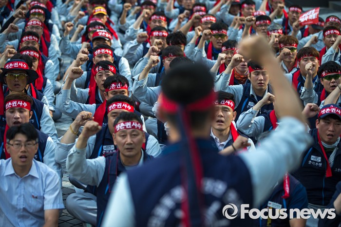 (서울=포커스뉴스) 29일 오전 서울 서초구 삼성 사옥 앞에서 삼성중공업 노동협의회 관계자들이 구조조정에 반대하는 시위를 하고 있다. 삼성중공업은 지난 15일 임원들의 임금 반납, 희망퇴직 등이 포함된 구조조정안을 공개했으며 올해 약 1500명 규모의 희망퇴직을 단행할 계획이라 밝혔다.