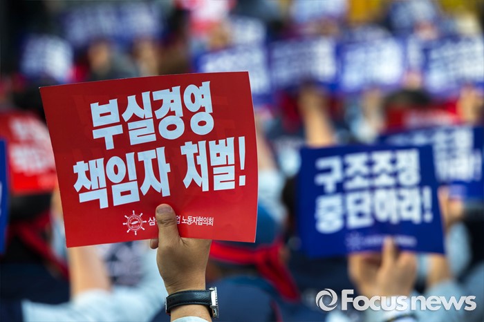 (서울=포커스뉴스) 29일 오전 서울 서초구 삼성 사옥 앞에서 삼성중공업 노동협의회 관계자들이 구조조정에 반대하는 시위를 하고 있다. 삼성중공업은 지난 15일 임원들의 임금 반납, 희망퇴직 등이 포함된 구조조정안을 공개했으며 올해 약 1500명 규모의 희망퇴직을 단행할 계획이라 밝혔다.