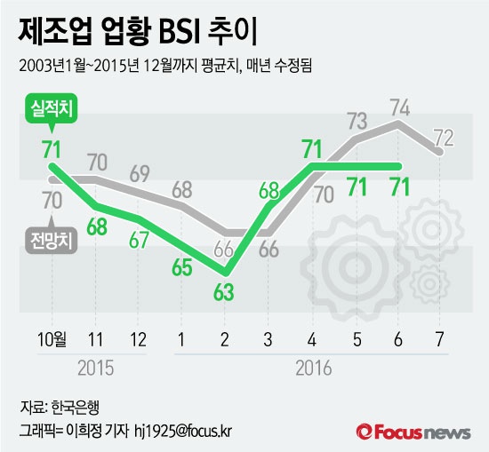 (서울=포커스뉴스) 29일 한국은행이 공개한 자료에 따르면 올 6월 제조업의 업황 기업경기실사지수(BSI)는 71로 나타났다. 국내 제조업 체감경기가 3개월째 보합권을 맴돌고 있다.