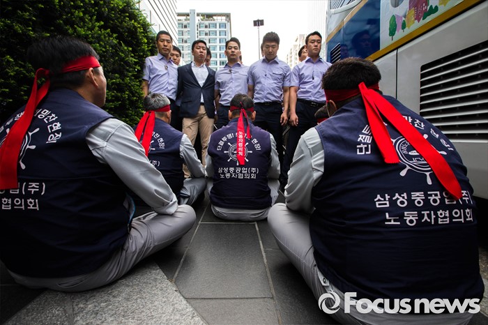 (서울=포커스뉴스) 29일 오전 서울 서초구 삼성 사옥 앞에서 삼성중공업 노동협의회 관계자들이 구조조정에 반대하는 항의서한을 삼성 측에 전달하기 위해 삼성의 보안요원들과 대치하고 있다. 삼성중공업은 지난 15일 임원들의 임금 반납, 희망퇴직 등이 포함된 구조조정안을 공개했으며 올해 약 1500명 규모의 희망퇴직을 단행할 계획이라 밝혔다.