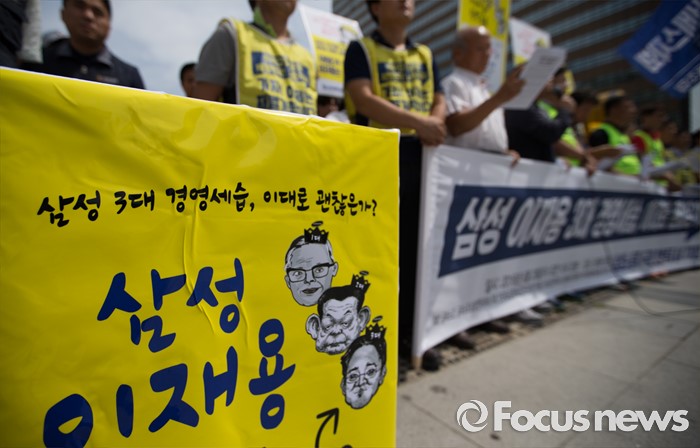 (서울=포커스뉴스) 29일 오전 서울 광화문광장에서 전국금속노동조합 삼성전자서비스지회와 반올림, 참여연대 등 시민단체들이 '삼성 이재용 3대 세습, 이대로 괜찮은가?' 찬반투표 선포 기자회견을 하고 있다.