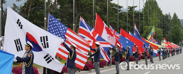(대전=포커스뉴스) 29일 오전 대전 유성구 국립대전현충원에서 열린 제3회 유엔참전국 국기 게양식에서 의전단이 6·25 전쟁 참전국 국기를 깃대에 걸고 있다.