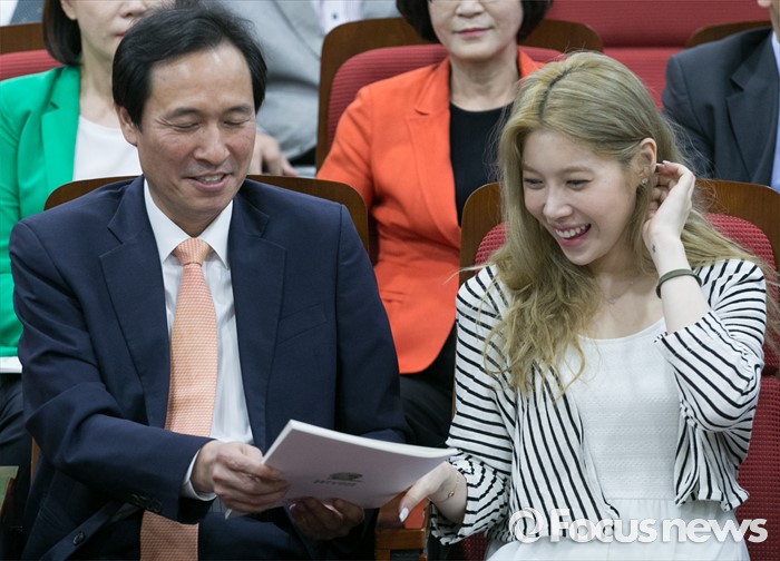 (서울=포커스뉴스) 29일 오후 서울 여의도 국회 의원회관에서 열린 동물복지포럼 출범식에 참석한 우상호(왼쪽) 더불어민주당 원내대표와 가수 배다해가 대화하고 있다.