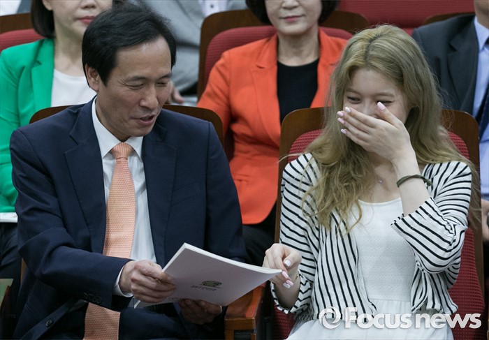 (서울=포커스뉴스) 29일 오후 서울 여의도 국회 의원회관에서 열린 동물복지포럼 출범식에 참석한 우상호(왼쪽) 더불어민주당 원내대표와 가수 배다해가 대화하고 있다.