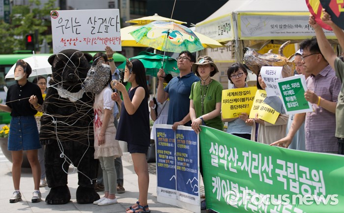 (서울=포커스뉴스) 설악산국립공원지키기국민행동 등 환경단체가 29일 오후 서울 광화문광장에서 설악산-지리산국립공원 케이블카추진 공동 규탄 기자회견을 하고 있다.