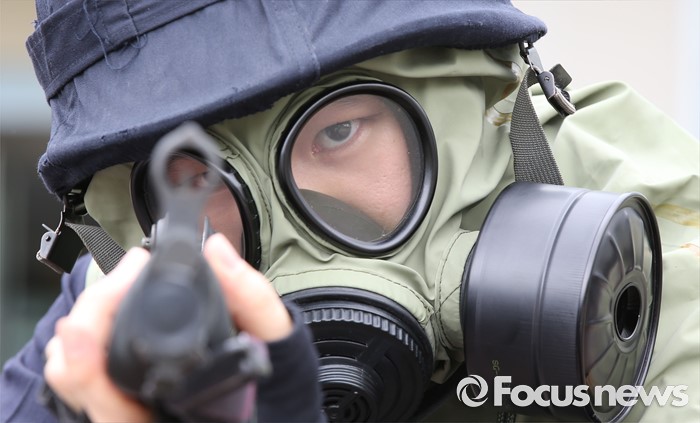 (세종=포커스뉴스) 29일 오후 세종시 정부세종청사경비대에서 열린 적 특수전부대원 침투 및 화학폭탄 폭발 대응 민·관·군·경 합동 민방위훈련에서 경력이 테러발생지점에서 경계하고 있다.