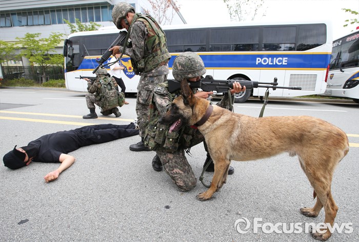 (세종=포커스뉴스) 29일 오후 세종시 정부세종청사경비대에서 열린 적 특수전부대원 침투 및 화학폭탄 폭발 대응 민·관·군·경 합동 민방위훈련에서 32시단 병력들이 테러범을 소탕하고 있다.