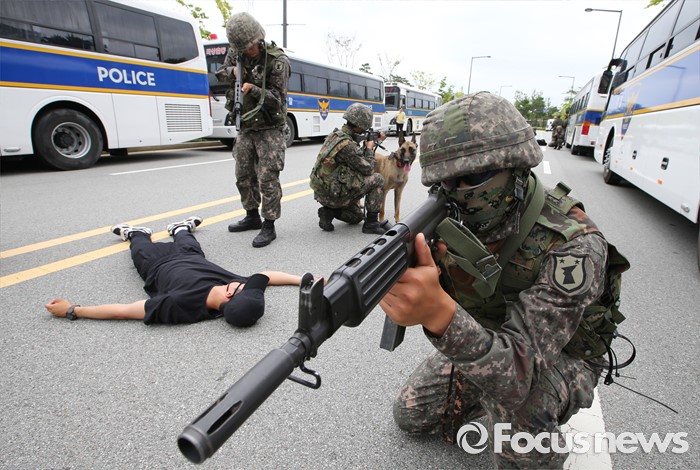 (세종=포커스뉴스) 29일 오후 세종시 정부세종청사경비대에서 열린 적 특수전부대원 침투 및 화학폭탄 폭발 대응 민·관·군·경 합동 민방위훈련에서 32시단 병력과 경력이 테러범을 소탕하고 있다.