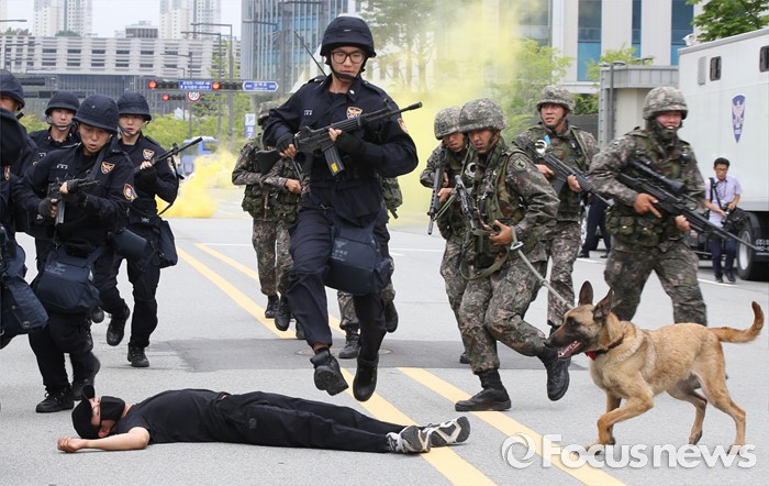 (세종=포커스뉴스) 29일 오후 세종시 정부세종청사경비대에서 열린 적 특수전부대원 침투 및 화학폭탄 폭발 대응 민·관·군·경 합동 민방위훈련에서 32시단 병력과 경력들이 테러범을 추적하고 있다.