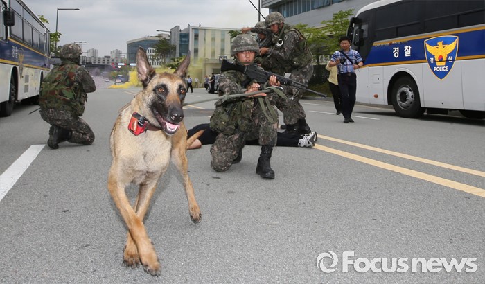 (세종=포커스뉴스) 29일 오후 세종시 정부세종청사경비대에서 열린 적 특수전부대원 침투 및 화학폭탄 폭발 대응 민·관·군·경 합동 민방위훈련에서 32시단 병력들이 테러범을 소탕하고 있다.