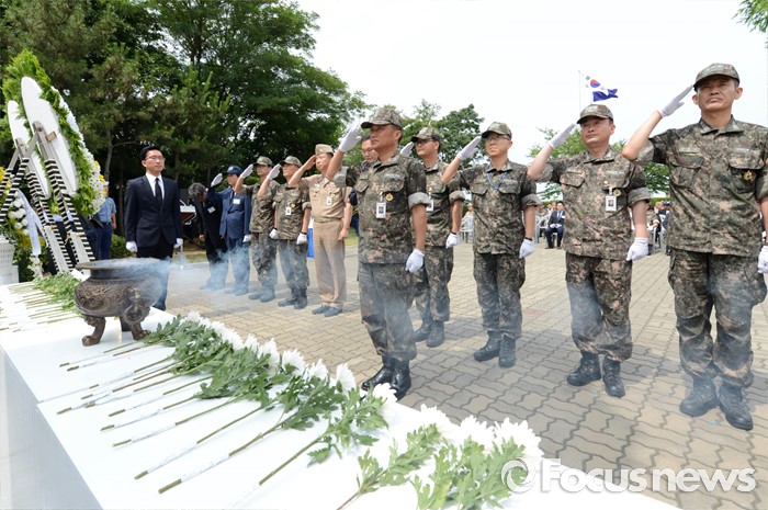 (서울=포커스뉴스) 29일 경기 평택시 해군2함대사령부에서 열린 제2연평해전 14주년 기념행사에서박동선 해상전투단장(준장)을 비롯한 해군 2함대 지휘관들이 제2연평해전 6용사에 대하여 경례하고 있다. <사진제공=해군>
