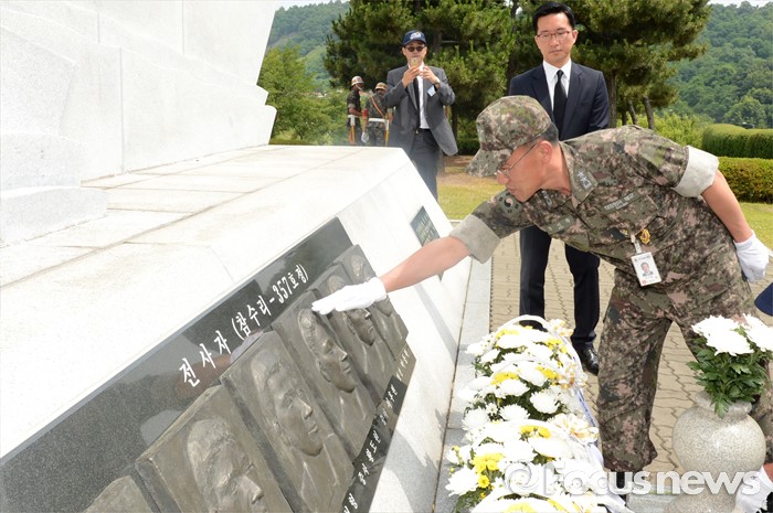 (서울=포커스뉴스) 29일 경기 평택시 해군2함대사령부에서 열린 제2연평해전 14주년 기념행사에서 부석종 2함대사령관(소장)이 6용사의 부조를 어루만지고 있다. <사진제공=해군>