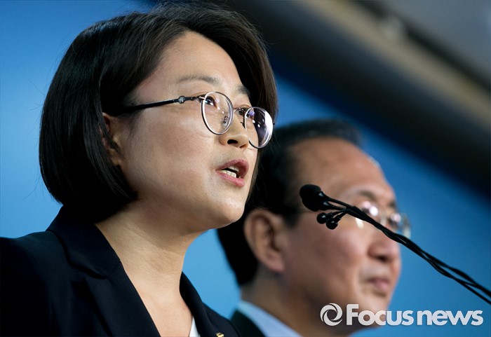 (서울=포커스뉴스) 29일 오후 서울 여의도 국회 정론관에서 미래창조과학방송통신위원회 재배정을 요구하며 농성에 들어갔던 추혜선(왼쪽) 정의당 의원과 노회찬 원내대표가 농성을 해제하고 외교통일위원회 배정을 받아들이는 내용의 기자회견을 하고 있다.