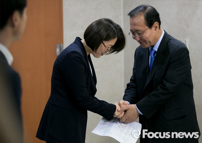 (서울=포커스뉴스) 29일 오후 서울 여의도 국회 정론관에서 미래창조과학방송통신위원회 재배정을 요구하며 농성에 들어갔던 추혜선(왼쪽) 정의당 의원과 노회찬 원내대표가 농성을 해제하고 외교통일위원회 배정을 받아들이는 내용의 기자회견을 마친 뒤 악수하고 있다.