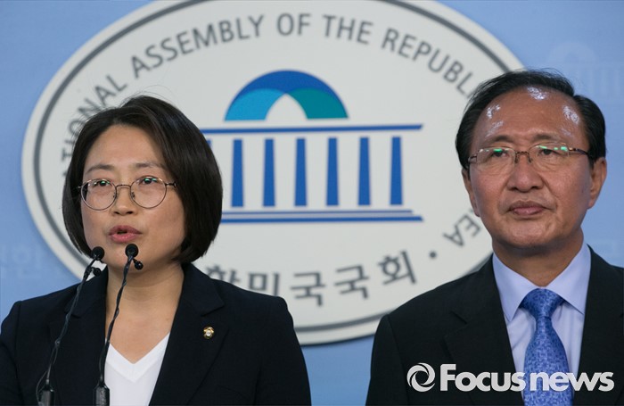 (서울=포커스뉴스) 29일 오후 서울 여의도 국회 정론관에서 미래창조과학방송통신위원회 재배정을 요구하며 농성에 들어갔던 추혜선(왼쪽) 정의당 의원과 노회찬 원내대표가 농성을 해제하고 외교통일위원회 배정을 받아들이는 내용의 기자회견을 하고 있다.