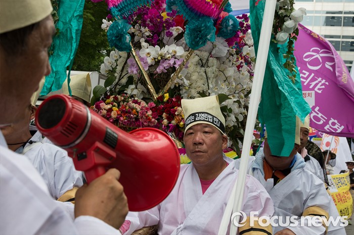 (서울=포커스뉴스) 29일 오후 서울 영등포구 국회의사당 인근에서 전국화훼협회 등 27개 단체원들이 김영란법 반대를 외치며 꽃상여를 메고 행진하고 있다.