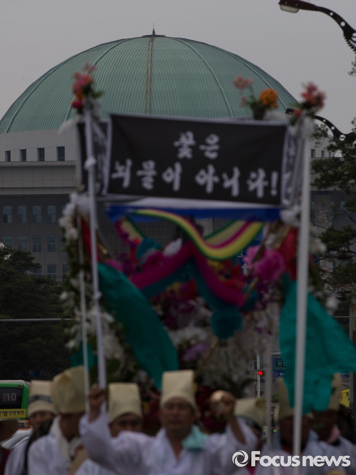 (서울=포커스뉴스) 29일 오후 서울 영등포구 국회의사당 인근에서 전국화훼협회 등 27개 단체원들이 김영란법 반대를 외치며 꽃상여를 메고 행진하고 있다.