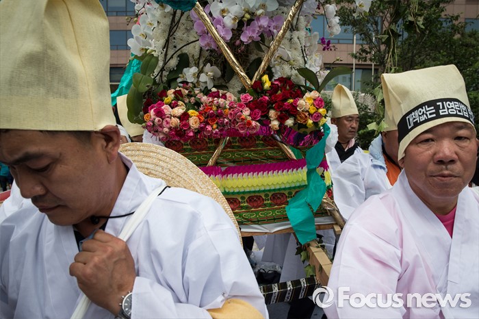 (서울=포커스뉴스) 29일 오후 서울 영등포구 국회의사당 인근에서 전국화훼협회 등 27개 단체원들이 김영란법 반대를 외치며 꽃상여를 메고 행진하고 있다.