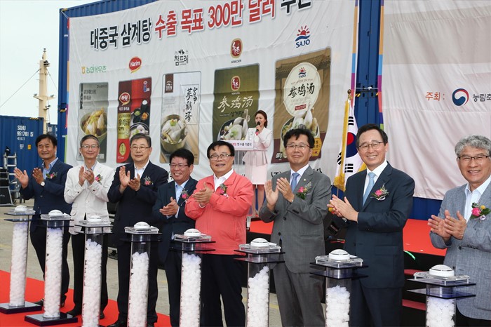 (군산=포커스뉴스) 이동필 농림축산식품부 장관이 29일 전북 군산항 컨테이너터미널에서 열린 대 중국 삼계탕 첫 수출 기념식 행사장에서 송하진 전라북도지사 등이 참석한 가운데 삼계탕 선적을 축하하며 박수를 치고 있다. <사진제공=농림축산식품부>