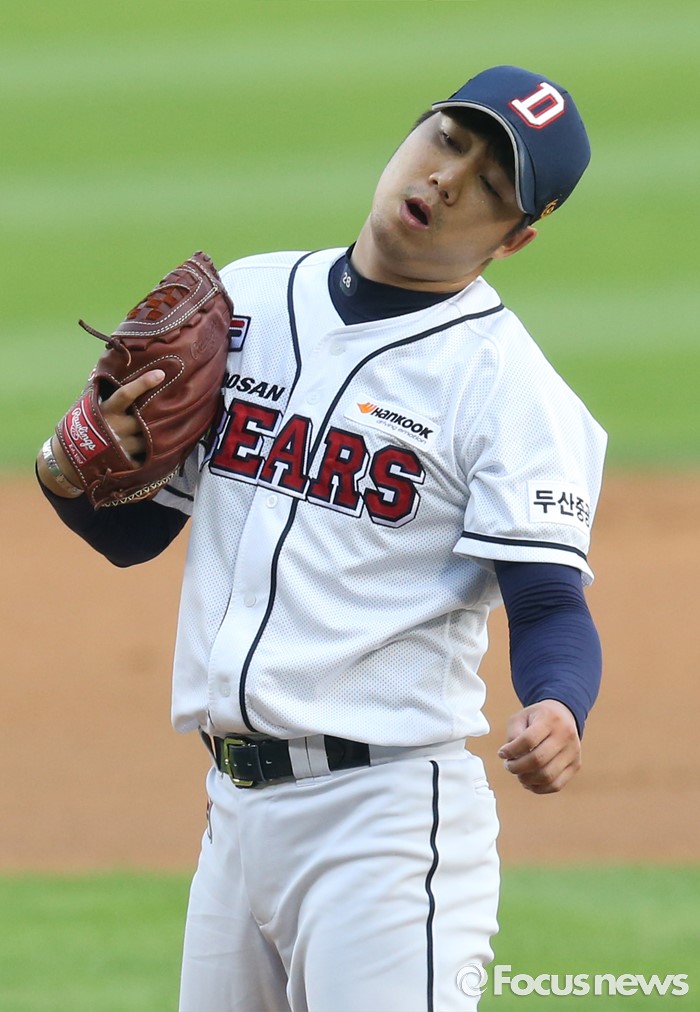 (서울=포커스뉴스) 29일 서울 잠실구장에서 열린 2016 프로야구 NC-두산 경기에서 1회초 두산 선발투수 장원준이 주심의 볼 판정에 아쉬워하고 있다.