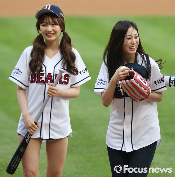 (서울=포커스뉴스) 29일 서울 잠실구장에서 열린 2016 프로야구 NC-두산 경기에서 시구와 시타를 마친 걸그룹 '러블리즈'의 서지수(오른쪽)와 류수정이 인사를 하며 그라운드를 빠져 나가고 있다.