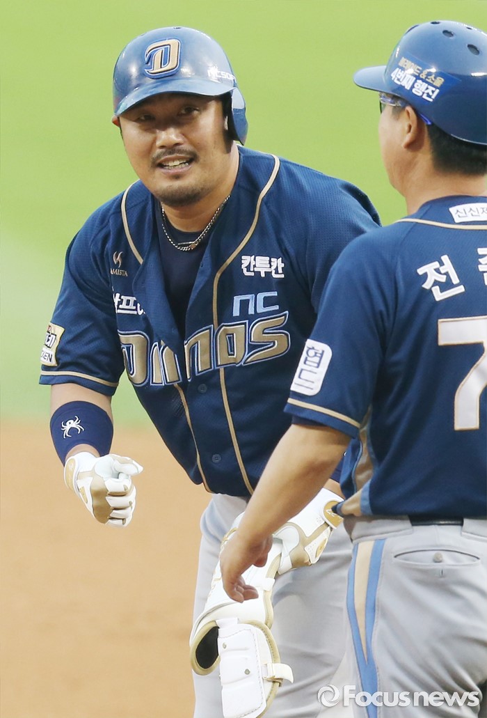 (서울=포커스뉴스) 29일 서울 잠실구장에서 열린 2016 프로야구 NC-두산 경기 3회초 1사 1,2루에서 NC 이호준이 1타점 우전 적시타를 날리고 전준호 코치의 축하를 받고 있다.