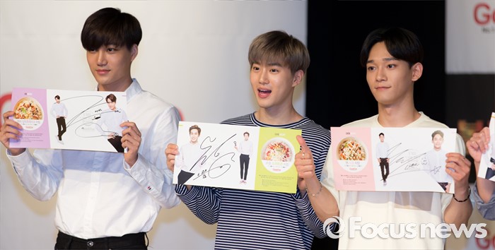 (서울=포커스뉴스) 29일 오후 서울 강남구 일지아트홀에서 열린 '굽네 볼케이노와 함께하는 엑소(EXO) 치밥 쿠킹 팬사인회'에서 카이(왼쪽부터), 수호, 첸이 포즈를 취하고 있다.