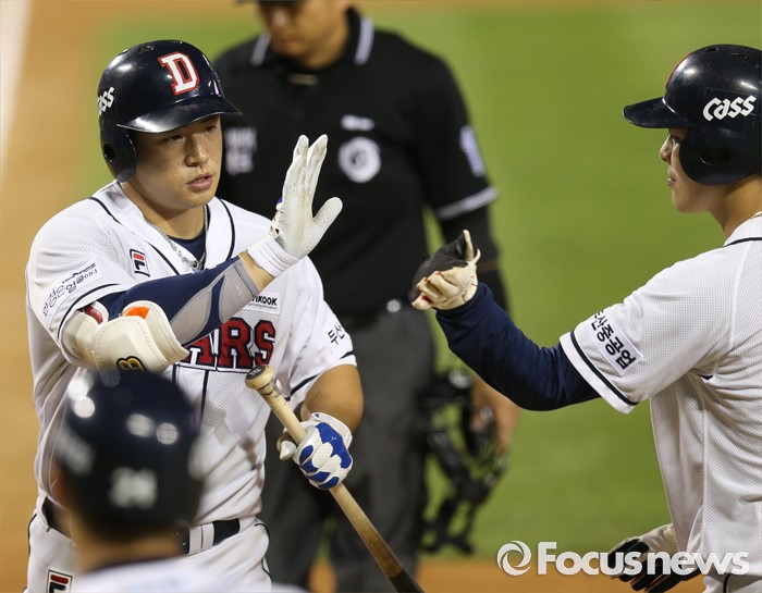 | △ 민병헌과 하이파이브하는 김재환 |