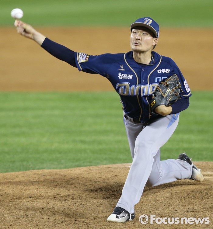 (서울=포커스뉴스) 29일 서울 잠실구장에서 열린 2016 프로야구 NC-두산 경기에서 NC 투수 원종현이 8회말에 등판해 투구하고 있다.