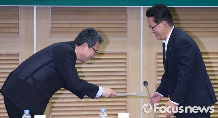 (서울=포커스뉴스) 30일 오전 서울 여의도 국회 의원회관에서 열린 국민의당 22차 집중역량강화 워크숍에 참석한 김성식(왼쪽) 정책위의장이 박지원 비대위원장에게 우수의원상 시상을 하고 있다.