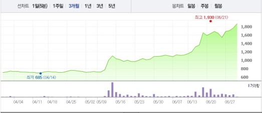 그 전에도 키스톤글로벌은 10일부터 17일까지 6거래일 연속 상승세를 나타내는 등 상승곡선을 그려왔다. 1달 전 주가인 5월30일(1090원)과 비교했을 때 무려 71.1% 상승한 수치다.