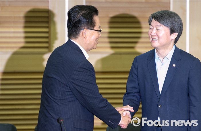 (서울=포커스뉴스) 30일 오전 서울 여의도 국회 의원회관에서 국민의당 22차 집중역량강화 워크숍을 마친 박지원(왼쪽) 비대위원장과 안철수 전 대표가 악수하고 있다.