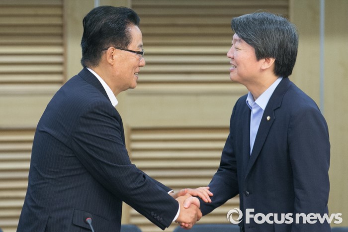 (서울=포커스뉴스) 30일 오전 서울 여의도 국회 의원회관에서 국민의당 22차 집중역량강화 워크숍을 마친 박지원(왼쪽) 비대위원장과 안철수 전 대표가 악수하고 있다.