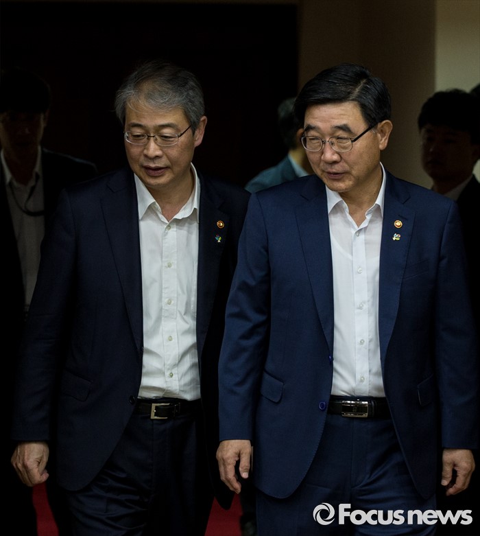 (서울=포커스뉴스) 30일 오전 서울 종로구 정부서울청사에서 열린 제2차 산업경쟁력 강화 관계장관회의에 임종룡 금융위원장과 이기권 고용노동부 장관이 참석하고 있다.