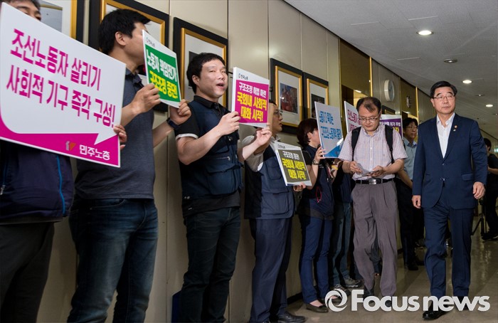 (서울=포커스뉴스) 30일 오전 서울 중구 프레스센터에서 열린 제45차 고용정책심의회에 이기권 고용노동부 장관이 참석하는 가운데 양대노총 관계자들이 구조조정 중단을 요구하는 구호를 외치고 있다.