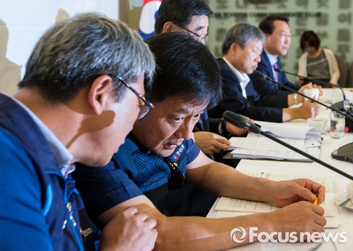 (서울=포커스뉴스) 30일 오전 서울 중구 프레스센터에서 열린 제45차 고용정책심의회에 참석한 김종인(왼쪽) 민주노총 부위원장과 박대수 한국노총 부위원장이 대화하고 있다.
