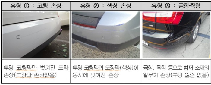 한편, 보험개발원이 조사한 바에 따르면 2013년부터 2015년까지 사고 발생 시 범퍼 교체율은 평균 70%에 육박하며, 지급보험금 100만원 이하 소액 사고 중 상당수는 경미한 손상임에도 범퍼 등을 새 부품으로 교체한 것으로 추정했다.금융감독원이 지정한 경미한 사고의 대표적인 사례.<자료제공=금융감독원>