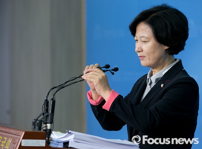 (서울=포커스뉴스) 전당대회 출마를 선언한 추미애 더불어민주당 의원이 30일 오전 서울 여의도 국회 정론관에서 새만금 공항 건설 공약과 관련 기자회견을 하고 있다.