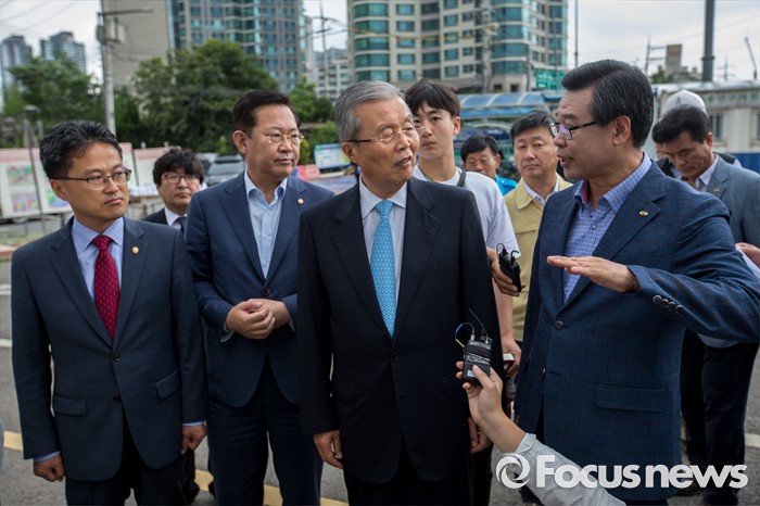 (서울=포커스뉴스) 김종인(왼쪽 두 번째) 더불어민주당 비상대책위 대표와 성장현(오른쪽) 용산구청장이 30일 오전 서울 용산구 한강로 빗물펌프장을 방문해 대화를 나누고 있다.