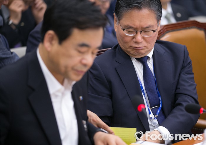 (서울=포커스뉴스) 30일 오전 서울 여의도 국회에서 열린 교육문화체육관광위원회 전체회의에 참석한 김호섭(오른쪽) 동북아역사재단 이사장이 관계자로부터 메모를 전달받고 있다.