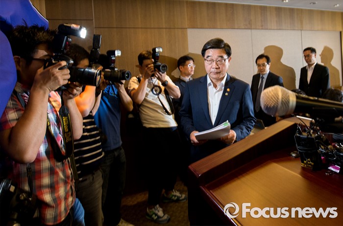 (서울=포커스뉴스) 30일 오전 서울 중구 프레스센터에서 이기권 고용노동부 장관이 조선업 특별고용지원업종 지정안 심의결과를 발표하기 위해 연단으로 향하고 있다.