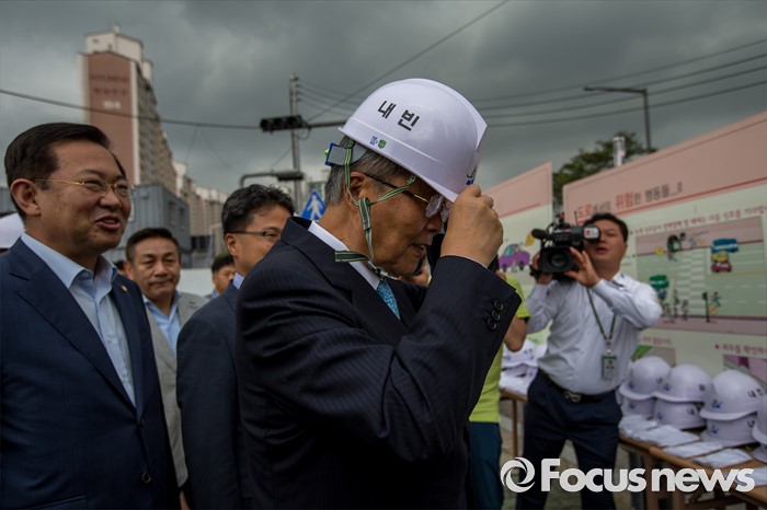 (서울=포커스뉴스) 김종인 더불어민주당 비상대책위 대표가 30일 오전 서울 용산구 한강로 빗물펌프장을 방문해 관계자에게 현황 설명을 전달 받은 뒤 안전모를 착용 하고 있다.