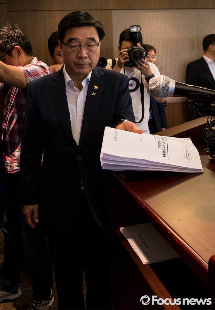 (서울=포커스뉴스) 30일 오전 서울 중구 프레스센터에서 이기권 고용노동부 장관이 조선업 특별고용지원업종 지정안 심의결과를 발표하기 위해 연단으로 향하고 있다.