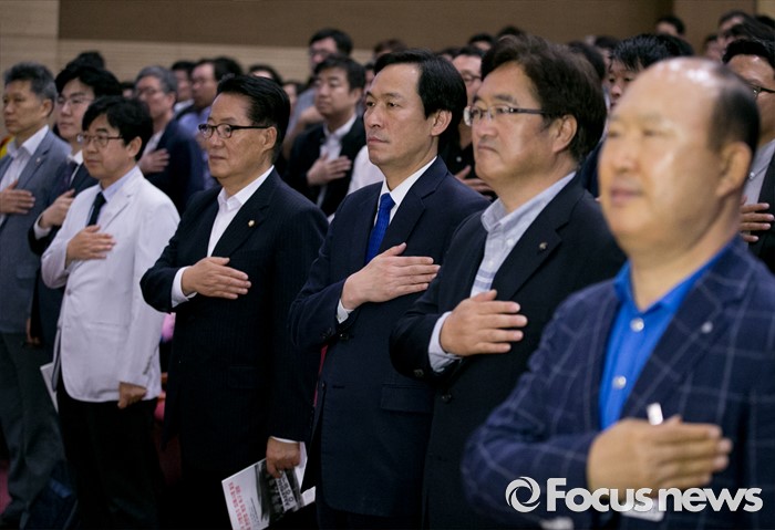 (서울=포커스뉴스) 30일 오후 서울 여의도 국회 의원회관에서 열린 전국가맹점주 피해사례 발표 및 관련법 개정촉구 대회에 참석한 우원식(오른쪽 두번째부터) 더불어민주당 을지로위원장, 우상호 원내대표, 박지원 국민의당 원내대표 등 참석자들이 국기에 대한 경례를 하고 있다.