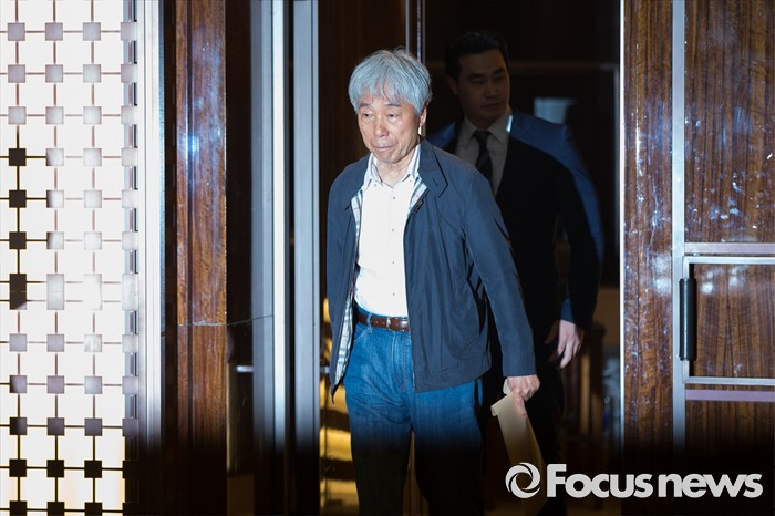 (서울=포커스뉴스) 위작 논란에 휩싸인 이우환 화백이 30일 오후 서울 중구 웨스틴조선 호텔에서 기자회견장으로 들어서고 있다.